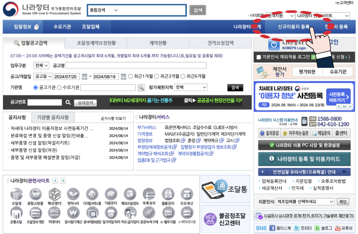 1. 나라장터 홈페이지에 접속 후 [신규 이용자 등록] 버튼 클릭