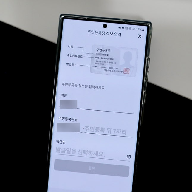 이 단계에서 개인 정보를 입력하고, 실물 신분증의 발급 일자를 확인하여 입력합니다.