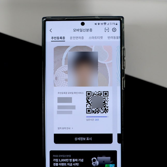 발급 완료 후, 사진, 이름, 거주지, QR코드 등을 확인할 수 있습니다. 별도의 인증 절차가 없어 자주 사용하는 경우 PASS 앱을 추천합니다.