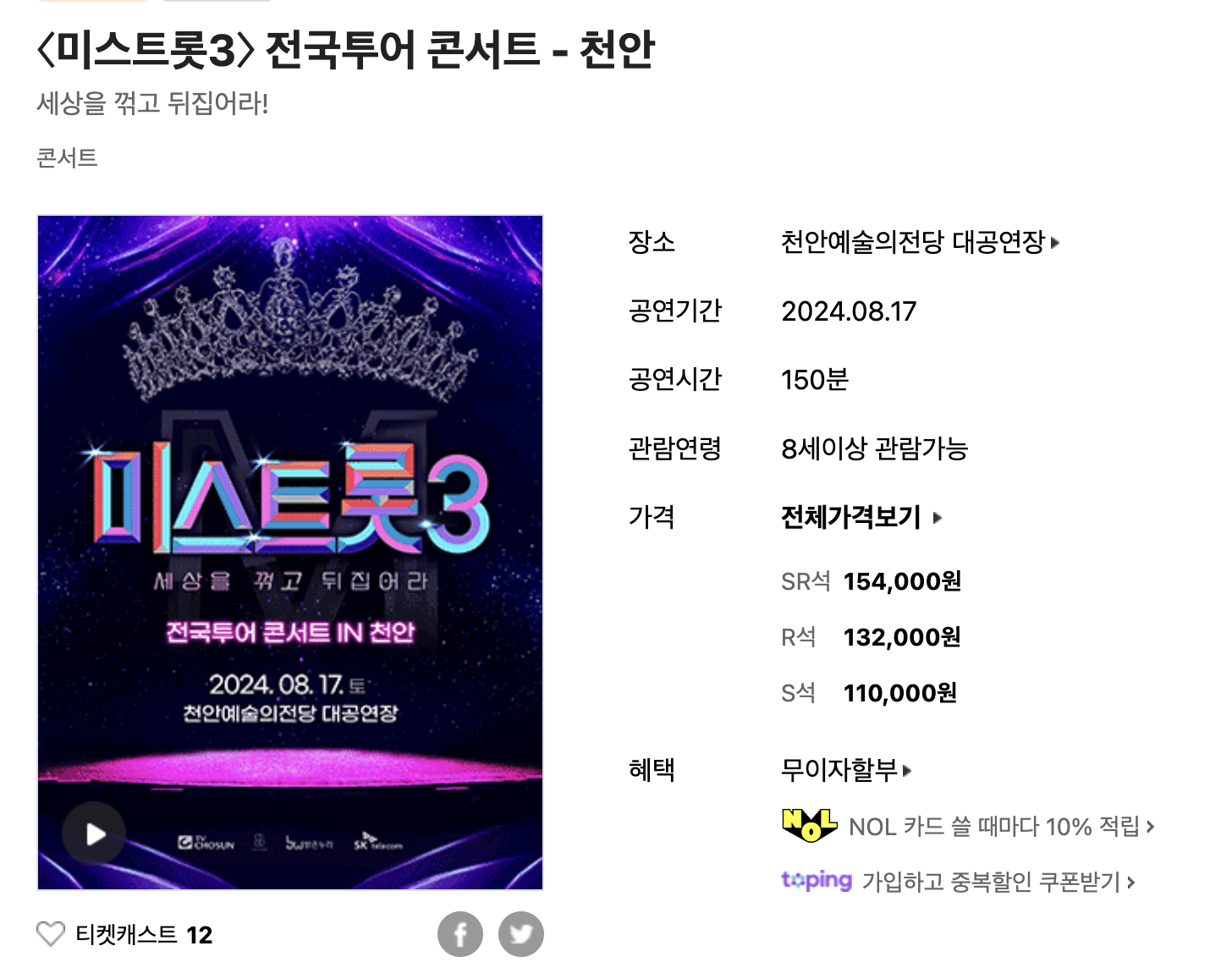 미스트롯3 전국투어 콘서트 in 천안이 조기 만석 예상되오니 미리 예매하시는 걸 추천드립니다. 천안에서 열리는 미스트롯3 콘서트 예매 정보 및 출연진, 티켓 배송 관련 정보, 교통 정보 등 콘서트 가기 전 꼭 알아야할 내용만 짚어드리겠습니다.