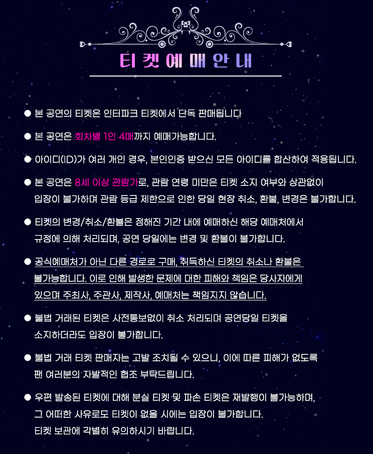 중요사항만 다시 짚어드리자면 본 공연은 회차별 1인 4매까지 예매 가능합니다.