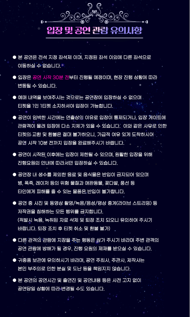 아래 입장 및 공연 관람 유의사항을 첨부드리니 콘서트 관람 전 참고하시기 바랍니다.