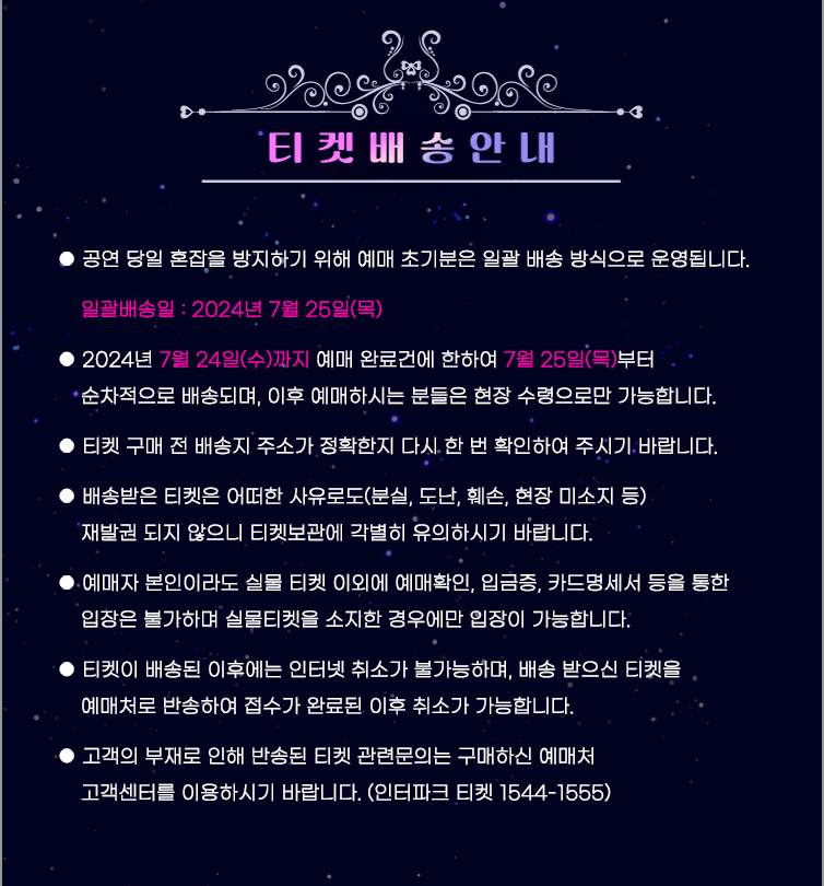 티켓은 7월 24일 (수)까지 예매 완료건에 한해, 7월 25일(목)부터 순차적으로 배송됩니다.