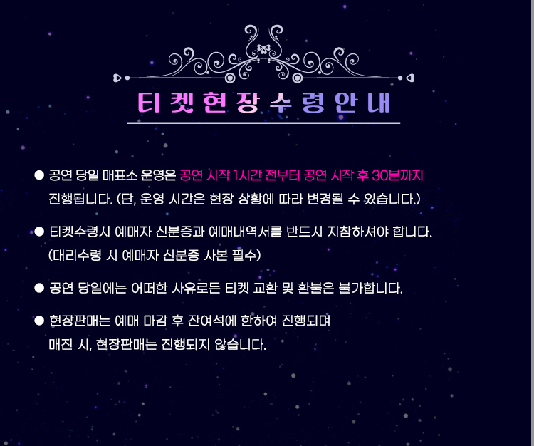 티켓 현장 수령은 공연 시작 1시간전부터 공연 시작후 30분까지 진행 예정이며