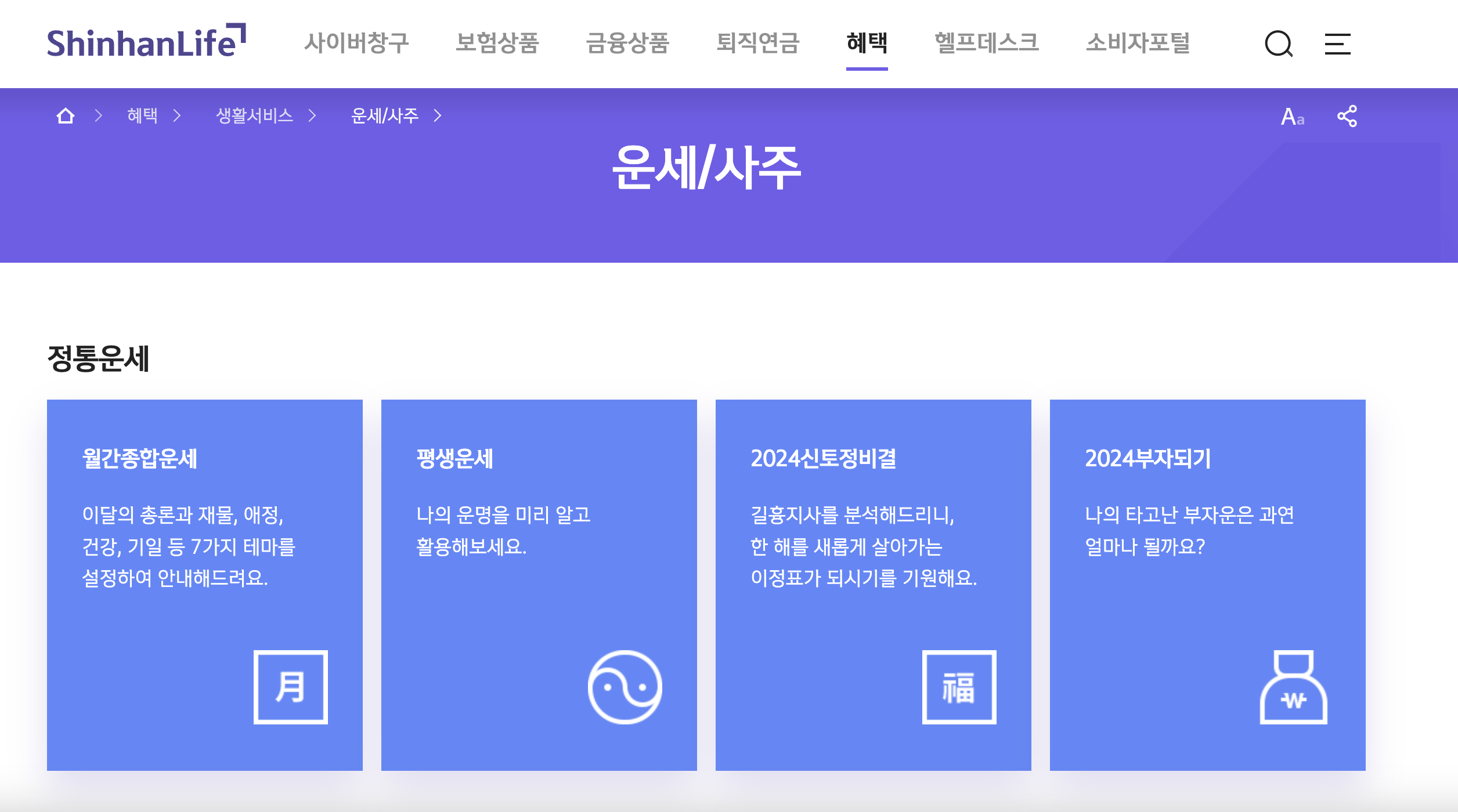 신한 라이프 홈페이지에서는 월간 운세와 평생운세 등 다양한 사주풀이를 무료로 제공하고 있습니다.