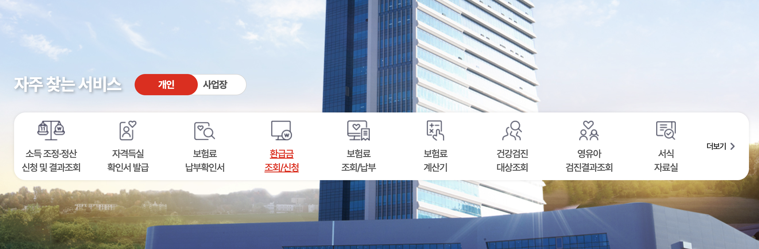 - 인터넷: 국민건강보험공단 홈페이지에 접속하여, '민원여기요' > '개인민원신청' > '환급금 조회 및 신청' 메뉴를 통해 온라인으로 신청합니다.