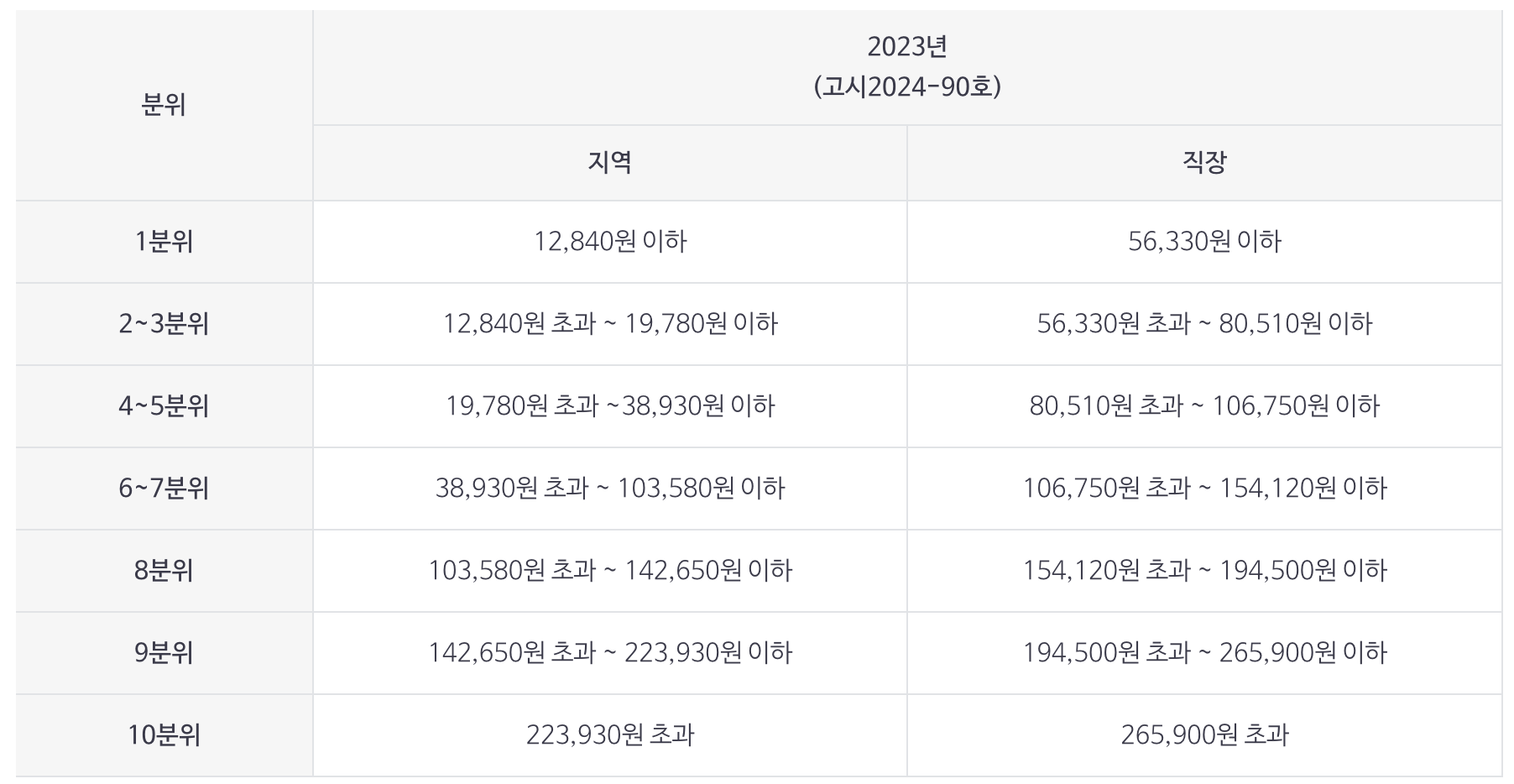 예를 들어, 2023년의 경우 지역가입자의 월 보험료가 12,840원 이하일 때 1분위로 분류됩니다.