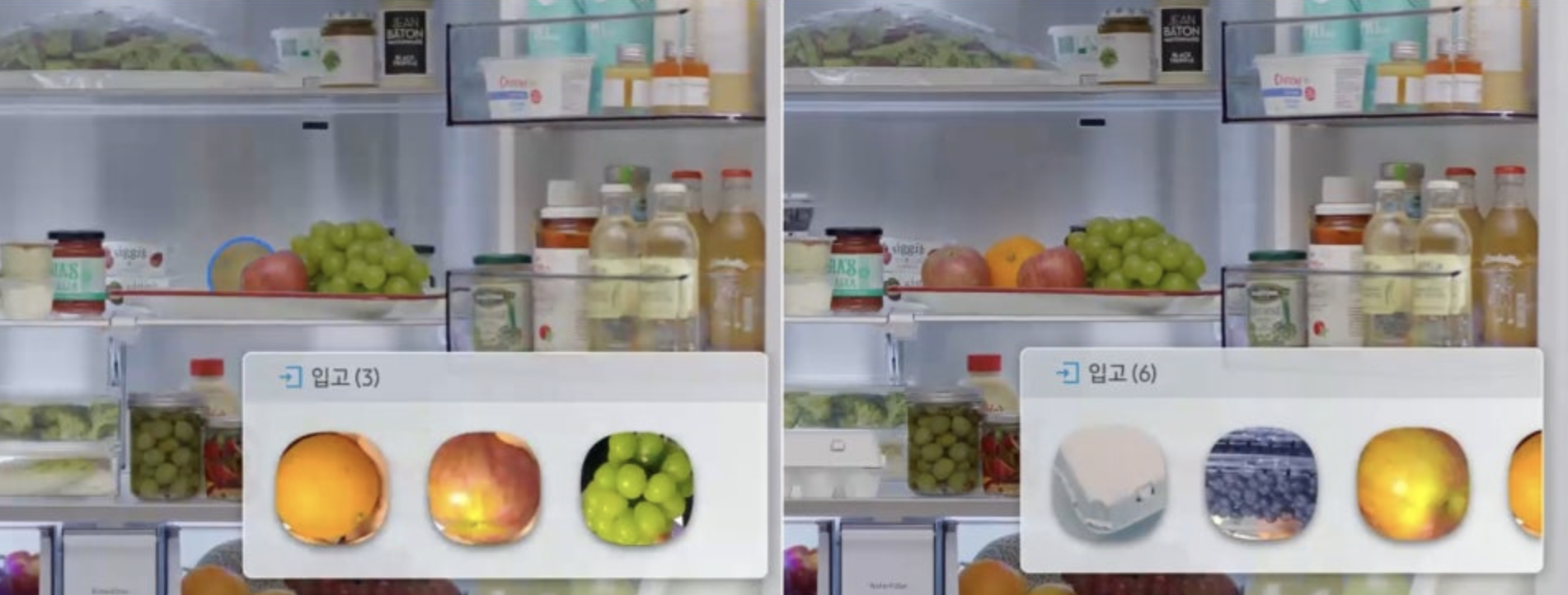 AI 비전 인사이드 기능은 상단에 장착된 카메라를 통해 냉장고 내부의 식재료를 자동으로 인식하고 관리합니다.