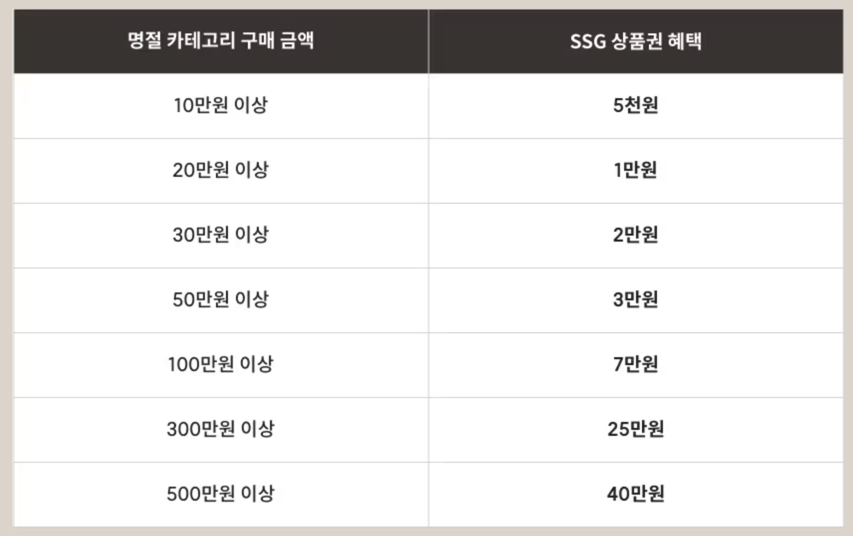 주목할 만한 할인 혜택으로는 명절 카테고리 구매 금액에 따라 SSG 상품권을 증정하고 있습니다.