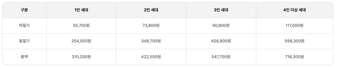 주민등록표 등본에 기재된 세대원 수로 산정하여 세대당 금액을 차등 지급합니다.