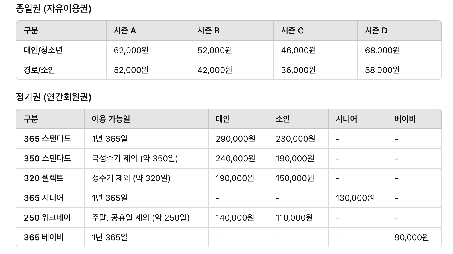 에버랜드 종일권(자유이용권) 및 정기권(연간회원권) 가격을 참고하세요.