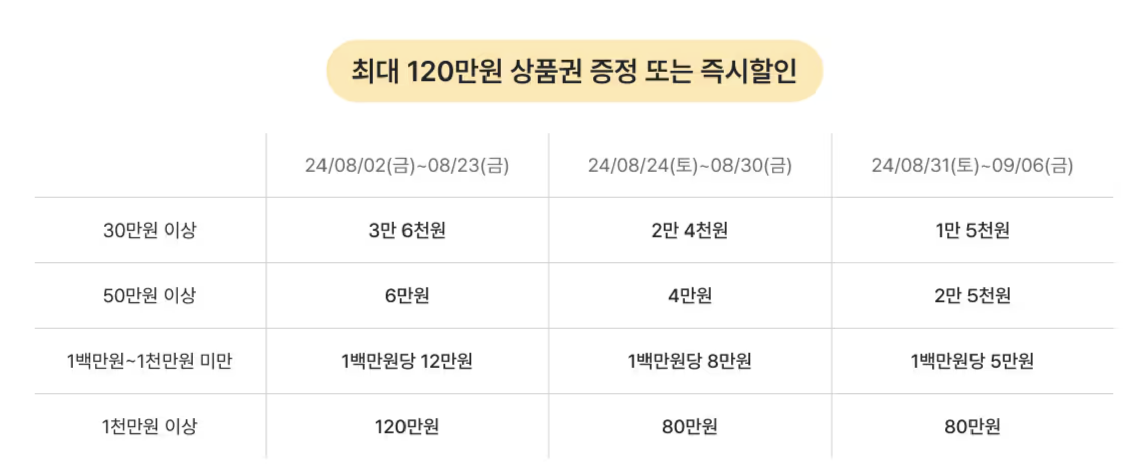 구매 금액에 따라 최대 120만원 상품권 제공 또는 즉시 할인되며 추가 2%적립 혜택까지 받아보세요.