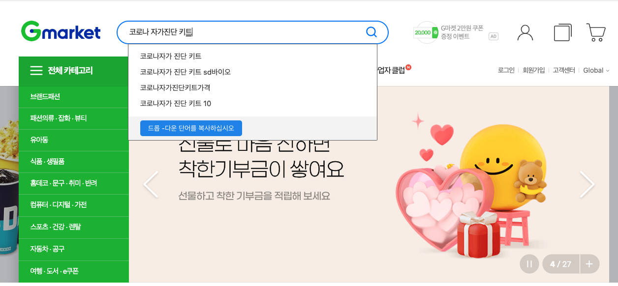 G마켓 (Gmarket): G마켓도 자가진단 키트의 큰 시장을 형성하고 있으며, 다양한 브랜드와 함께 많은 수량이 판매되고 있습니다.