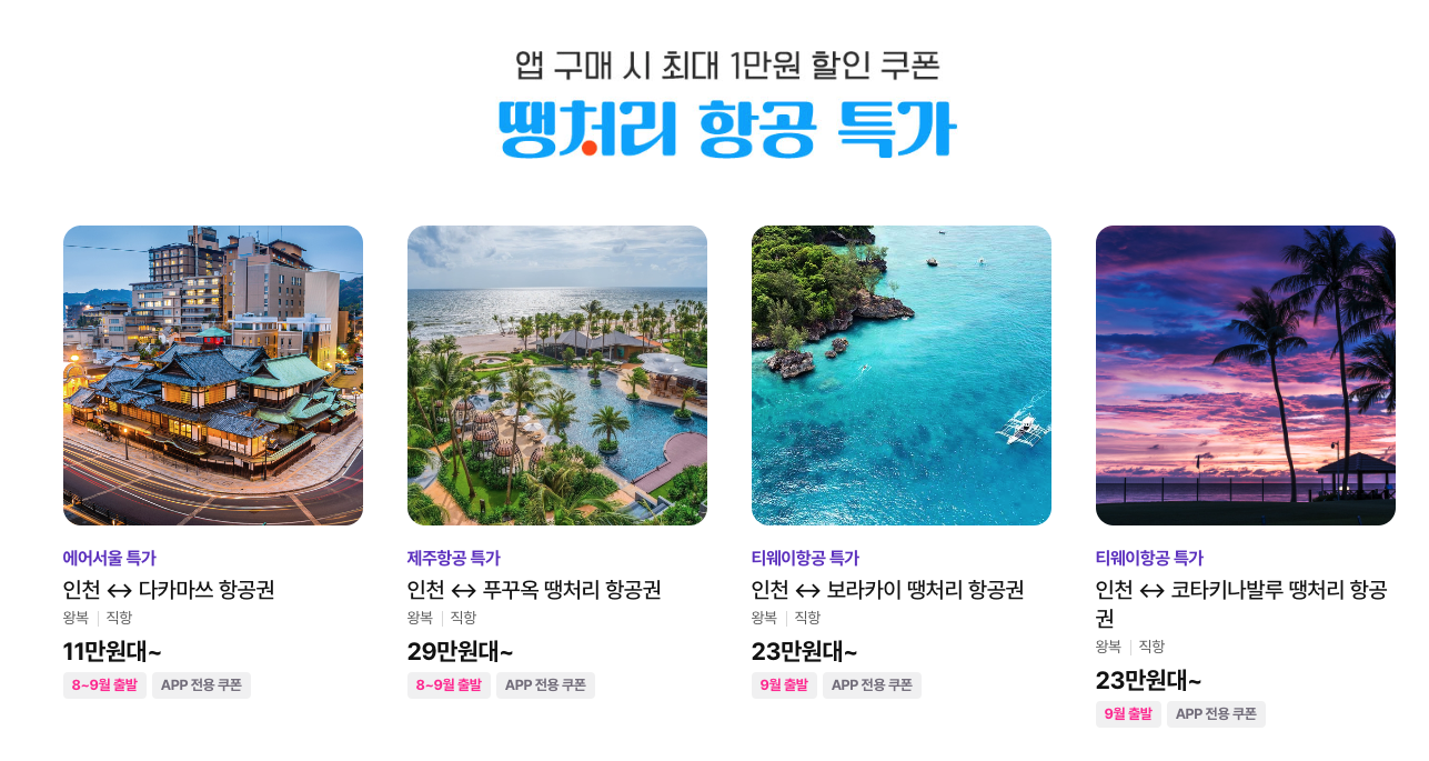 앱으로 구매하면 최대 1만원 할인 쿠폰 적용 가능한 땡처리 항공 특가 상품도 있습니다.