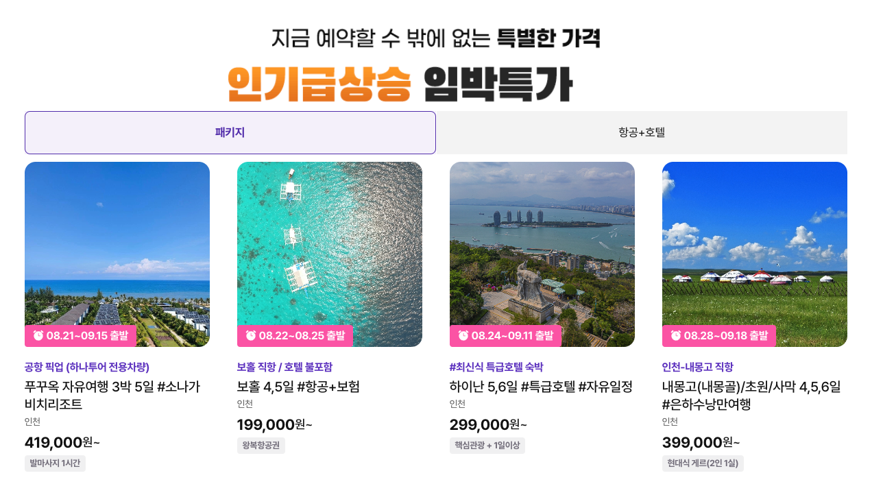 더욱 강력해진 할인 혜택을 제공하는 출발 임박 특가 여행상품도 이용해보세요.