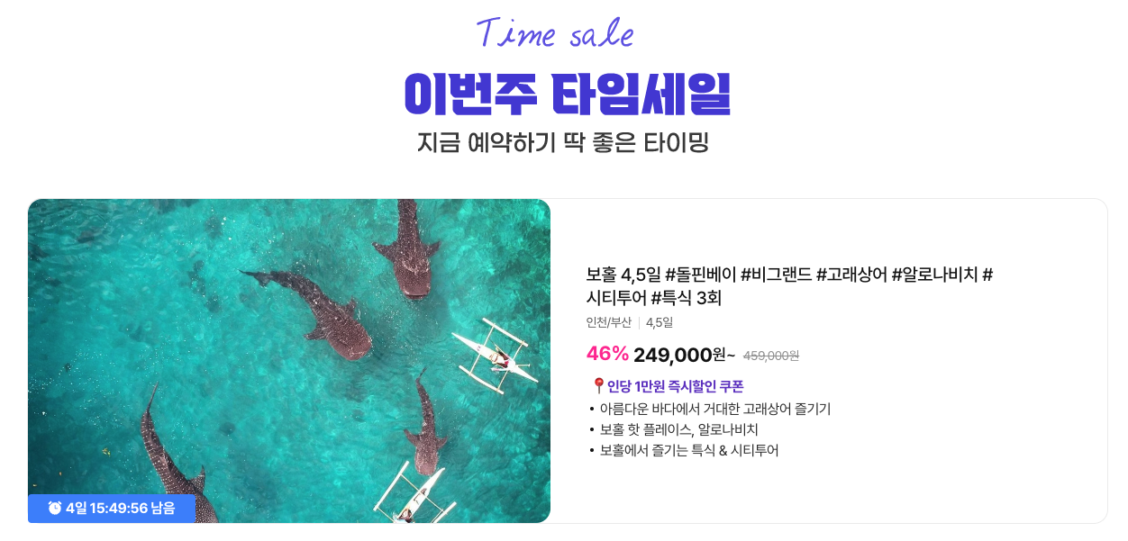 보홀, 동유럽 쿠알라룸푸르등 인기있는 여행 패키지 상품을 타임세일 기간동안 최대할인가에 구매 가능합니다.