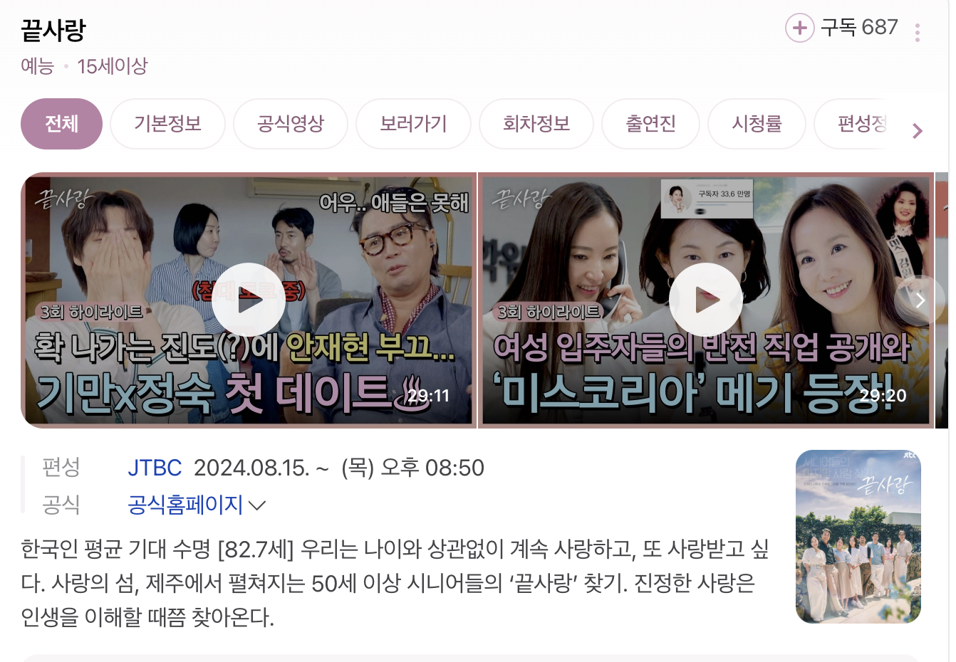 JTBC의 끝사랑은 50대 이상의 연애를 다루며 새로운 시도를 한 연애 예능 프로그램입니다.